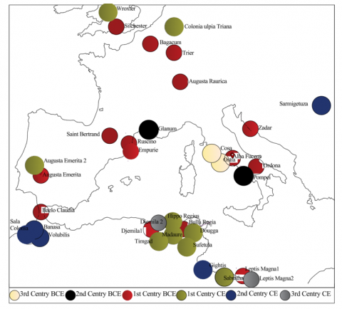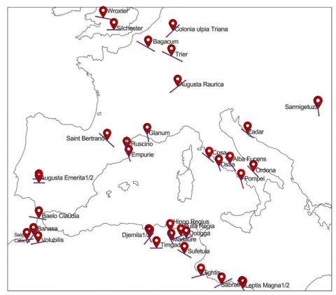 The study corpus's components were selected by means of an extensive literature review related to Roman town planning. The selection process has been undertaken in two consecutive stages. The first one consisted of compiling an inventory of the forums located in the Roman cities across Europe and North Africa. For the first continent, twenty (20) forums were selected that are located in the cities of the United Kingdom (Silchester and Wroxter), Germany (Colonia Ulpia Traiana and Trier), Italy (Alba Fucens, Cosa, Ordona, Ostia and Pompei), France (Bagacum, Glanum, Lugdunum and Ruscino), Switzerland (Augusta Raurica), Spain (Baelo Claudia, Augusta Emerita and Empuries), Romania (Sarmizegetusa) and Croatia (Zadar).