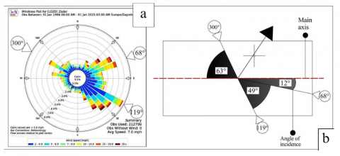 Adam [18] examined the orientation of towns and centuriations and revealed that northwest-southeast alignments often deviated from theoretical guidelines. His findings suggest that Roman surveyors made practical adjustments to accommodate local conditions [18]. For the case of Italian Roman cities, Vinaccia [19] revealed that many urban plans deviated by approximately 30° from the north-south axis in order to mitigate the effects of cold northern and northwestern winds while avoiding the damp, unhealthy southeastern winds. Additionally, such orientations ensured that sunlight reached all four sides of buildings, providing enhanced lighting and thermal benefits [19]. Further, El Alami [20] notes that diagonal alignments allowed structures to maximize southern sun light exposure while minimizing northern less sunlit one, thus reflecting the Romans’ preference for practicality over rigorous cardinal alignments [20].