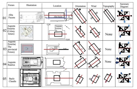 In terms of topography, while most forums were designed for flat terrain, Roman planners exhibited remarkable ingenuity in using natural features as they could. However, this research has certain limitations, such as the extent of detail, the archaeological character of the studied cases and the changeable nature of the climatic factors. Further research work should extend the study corpus to include other sites located in the middle-east and/or in Asia Minor, for instance. In addition, the outcomes could also be extended to: i) explore the forums as a complex of buildings and the location of each building in relation to the central open-to-sky square, and ii) the users way of life within these urban spaces in respect of the local climatic specificities varying both temporally and spatially.