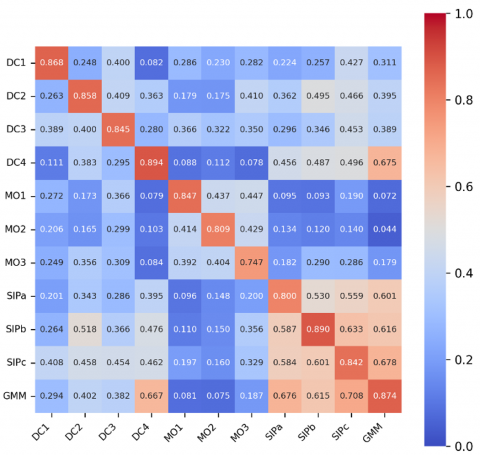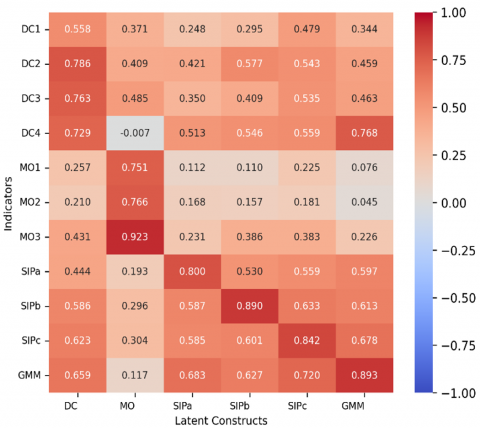 A minimum threshold of 0.70 was set for all components with intelligent features evaluated. Following, AVE values must exceed 0.50, while internal consistency (Cronbach-α and CR) should be above 0.70. Figure 2 presents the validity results based on these threshold values. The cross-loadings confirm discriminant validity, as each construct loads higher on its own factor than on any other [30]. The highest cross-loading was observed in the GMM, ranging from 0.676 to 0.708, which meets the required thresholds. This ensures each construct captures distinct phenomena.
