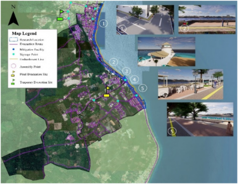 5. The arrangement strategies to improve the Comfort and Image of the public spaces focus on enhancing priority facilities and establishing environmental resilience. Key functional improvements prioritize facilities identified through IPA, including lighting, rubbish bins, toilets, vegetation, street vendors, bus stops, and pavement quality. At the same time, given the waterfront’s vulnerability to coastal hazards such as high waves and abrasion, structural and non-structural mitigation measures are integrated alongside Low-Impact Development (LID) principles. Structural measures include maintaining existing seawalls and providing multi-functional, earthquake-resistant evacuation buildings. Non-structural measures involve clear evacuation routes and early warning systems. LID strategies, such as permeable pavements and enhanced vegetation buffers, help reduce surface runoff, flooding, and erosion caused by coastal hazards. This holistic approach ensures that the waterfront remains comfortable, safe, and ecologically sustainable while accommodating diverse user needs. Arrangement of comfort and image can be seen in Figure 11.