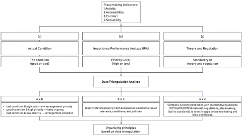 Data analysis was conducted descriptively to describe the condition of public spaces and the characteristics of the area, and the Importance Performance Analysis (IPA) method was used to evaluate the level of importance and performance of each aspect of placemaking [20]. The results of the two primary analyses (Actual Condition and IPA) were then triangulated and combined with an analysis of normative regulations to formulate guidelines for the functional and sustainable arrangement of waterfront public spaces. The Data Triangulation Analysis served as a synthesis mechanism that can be seen in Figure 2, systematically integrating findings from three streams: (a) Actual Condition, (b) Importance-Performance Analysis (IPA), and (c) Theory and Regulation. This rigorous process allowed us not only to establish development priority levels (by assessing a × b), but also to identify precise gaps between ideal and actual conditions (via a × c), ultimately resulting in Organizing Principles that are robustly justified by combining user interest, field conditions, and existing policy standards (b × c).