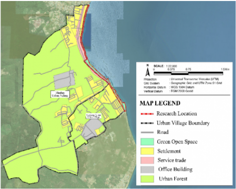The research location is in the waterfront areas of Maahas and Tombang Permai villages, which are characterized as public spaces, culinary tourism destinations, and water recreation areas. Based on the Rencana Detail Tata Ruang (RDTR) or Detailed Spatial Plan or the Luwuk Urban Area, the research location is in SWP II.B.2 (Tombang Permai Village) and SWP II.B.4 (Maahas Village) with development guidelines as city parks, green belts, residential parks, and conservation of green open spaces that serve social and aesthetic functions for recreational, educational, and urban community service activities. In line with these guidelines, Banggai Regency Regulation No. 10 of 2012 concerning the 2012–2032 Spatial Plan for Banggai Regency stipulates a development policy for Luwuk as the regency capital, focusing on trade and services, offices, housing, industry, and tourism, complemented by a transportation infrastructure system and public service facilities through the arrangement of water areas to support the realization of the Luwuk Urban Area as a waterfront city.
