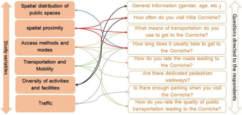 More than seventy people who frequent the place on a regular basis filled out the questionnaire. Several essential questions were presented to assess the site's accessibility, and the relationship between each question and the study variables was defined, as illustrated in Figure 11.