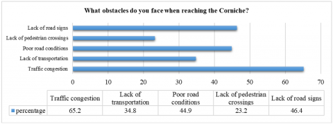 Regarding the most prominent obstacles identified in accessing the Corniche, 65.2% of respondents stated that there was traffic congestion, while 34.8% identified a lack of transportation options, 44.9% pointed to poor road conditions, 23.2% mentioned the absence of pedestrian walkways, and 46.4% noted the lack of directional signage as shown in Figure 13.