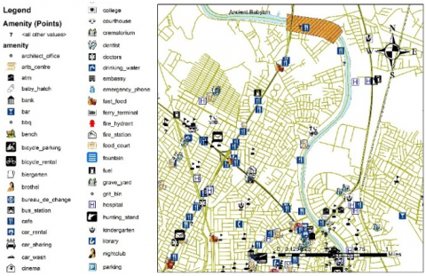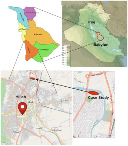 Figure 2. Location map of Hillah Corniche Site, based on the GIS, Google maps and map of Iraq [31-34]
