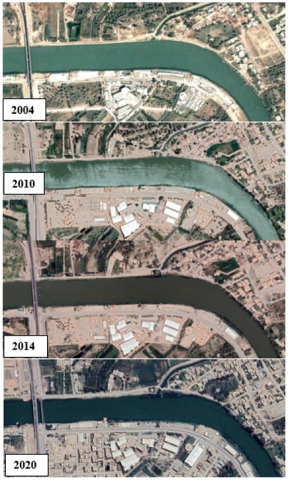 Despite the urban movement carried out by the Ministry of Culture and Tourism in 1987 to test the site for the construction of the hotel (Babylon Tourist Hotel) due to its strategic location and proximity to the ancient city of Babylon and its wide river view, the area was suffering from great isolation at first, specifically in 2004. Some leisure activities, such as private cafes on the river bank, began in 2011 and served as the beginnings of a population and housing attraction. Then, from 2014 to 2020, the situation remained unchanged due to the local government's lack of control, resulting in more slums, visual distortion, and the entire closure of the riverside, as depicted in the images of Figure 3.