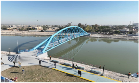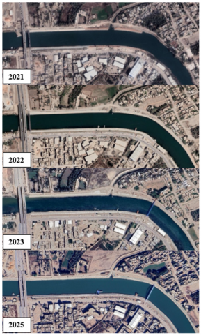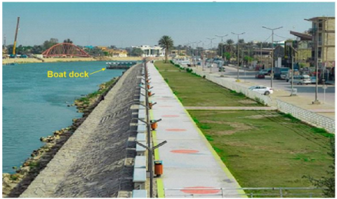 Major urban development began in 2021 when the Ministry of Water Resources designed and launched the Hillah Corniche development project, which involved reshaping and enhancing the area’s features. This project included urban upgrades to surrounding neighbourhoods and improvements in transportation by constructing a second road axis parallel to the Bith Bridge. Initial work in the study area was carried out as a pilot model within the first year and then extended along the river. In 2023, a pedestrian bridge—known as the Blue Space Bridge—was added, becoming a significant landmark and a point of attraction for local residents. Additionally, a boat marina was introduced during 2024–2025 to promote river transportation and recreational activities, as illustrated in Figure 4.