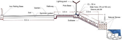All activities have been dispersed equally, allowing visitors to go freely to a specified spot. This is accomplished by organizing the activities in a linear arrangement, 20 meters wide, along the riverbank with a set cross-section divided into: