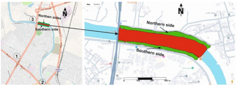 The space is surrounded by a wall made of iron railings to protect its occupants, with some entrances and exits to and from the premises. The site is rectangular in shape, 600 meters long and 120 meters wide (including the river), with a total area of 72,000 square meters stretching from the Bith Bridge to the Blue Bridge. The southern river bank is marked by its direct link to the city center, which is bustling with activity and home to the majority of inhabitants' favorite attractions, particularly the Babylon Tourist Hotel. The northern bank is distinguished by tranquility and solitude. The location of the study area is shown in Figure 2.