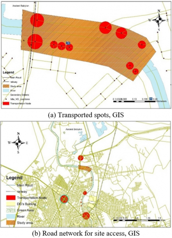 Field surveys were used to assess roadway and pedestrian walkway quality, as well as accessibility assessments using GIS and traffic flow analysis. The transportation network of Hillah was examined in general, with an emphasis on the area around the study site. Main roads, subsidiary roads, and transportation hubs were identified. Currently, three important traffic nodes are within 1 km of the site: 1. Al-Thawra Intersection to the south-west, 2. Bab Al-Hussein Intersection to the south, 3. the overpasses leading to the international highway to the north and the area surrounding of Bith Bridge, as shown in Figures 6 and 7. In addition, all smaller nodes along secondary highways and residential districts leading to the site were identified.