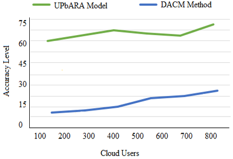 The grade of accuracy of this proposed method is high compared to the conventional DACM method. The proposed method reliably recognizes users and validates them and give them access to the data based on the registered users only. The level of accuracy is represented in Figure 13.