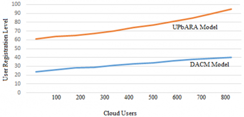 After the cloud was created, the users registered with the cloud and average effective registered times are shown in Figure 9. Based on the users requirement, the registration of the cloud will be performed and the load balancing need to be maintained after user registrations. The proposed model user registration is more as the load balancing is also done effectively.