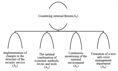 Figure 1. The main goal and its sub-goals in the form of corresponding hierarchical blocks (decision tree) for the model of countering external threats to corporate security of the engineering enterprise