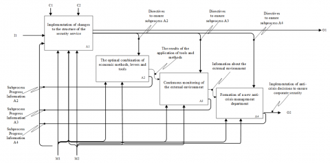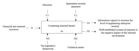 So, for the application of the chosen methodology, several basic aspects must be described: the main goal of modeling is to build a model that will facilitate the adoption of effective management decisions to counter external threats to the corporate security of an engineering enterprise; purpose: for subjects of corporate security, whose activities provide for the development and implementation of management decisions in the context of COVID-19; the main technology of the applied modeling method is IDEF0(Icam(Integrated Computer Aided Manufacturing) DEFinition for Function Modeling); software involves the use of an application program to build vector models and diagrams. The main advantage of this method is that it makes it possible to visually depict and clearly form all the stages of achieving the ultimate goal A0.