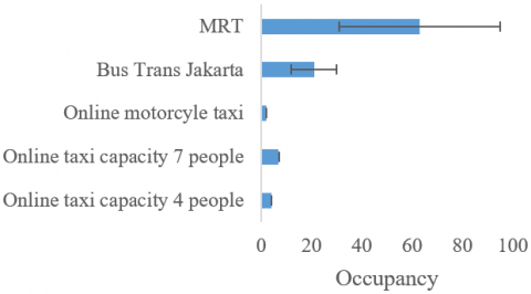 Based on the survey results, the average occupancy for MRT Jakarta is 63±32 passengers, while for Trans Jakarta Buses, it is 21±9 passengers. Meanwhile, online vehicles use the DKI Jakarta Provincial Transportation Agency's regulatory scheme. As for the details of the passenger configuration, two-line taxis are only allowed to carry two passengers with a composition of 1 driver and two passengers behind. As for three-row cars, a maximum of three passengers, with a composition of one driver in front, one passenger in the middle, and one passenger in the back row. In detail, the occupancy of public transportation in this study can be seen in Figure 2.