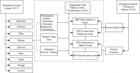 Information systems, in general, can be said to be a human and machine system that is integrated into the provision of information to support management operation functions and determine alternative actions in the organizational system. Information system components are grouped into software, hardware, data, humans, networks, input, output, storage, and control [29]. Information security is the protection of the confidentiality, integrity, and availability of information assets, either in storage, processing, or transmission through the application of policies, education, training and awareness, and technology [30]. In information security, there is a dimension of security behavior. Behavior is a study that studies human behavior starting from individual behavior, groups, and its effects on activities carried out [31]. Awareness of information security is a part of the Security Education, Training, and Awareness (SETA) program dedicated to keeping users aware of crucial issues related to information security through the use of newsletters, posters, and other methods [32]. This study used a quantitative descriptive method because it explains how the behavior and awareness of the information security of users of the Zoom application in the COVID-19 era are. This research is cross-sectional, in which data collection is done at one time only. A cross-sectional study is a study that studies the dynamics of the correlation between risk factors and effects using an observation approach or data collection once [33]. The following is the framework used in this study.