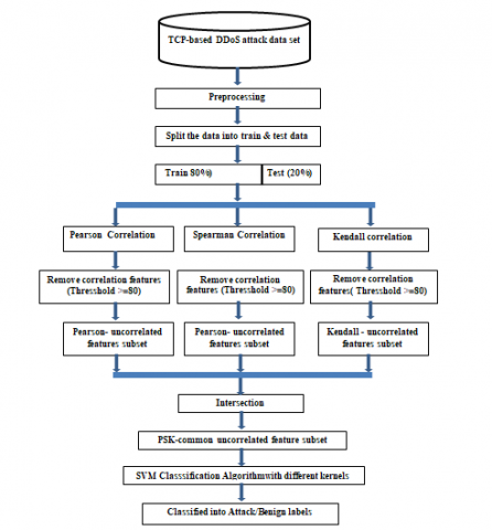 Remove correlation features which are selected by the Pearson correlation method for the data set features set, and create a Pearson un-correlation feature subset. Remove correlation features which are selected by the Spearman correlation method for the data set features set, and create a Spearman un-correlation feature subset. Remove features which are selected by the Kendall correlation method for the data set features set, and create a Kendall un-correlation feature subset. Create a PSK-common un-correlated feature subset by intersecting uncorrelated feature subsets of Pearson, Spearman, and Kendall correlation Techniques. Table 3 shows the number of PSK-common un-correlated features of the datasets. Table 4 shows the list of PSK-common un-correlated features of TCP-based DDoS attack data sets. Figure 1 and Figure 2 shows the PSK and TCP common un-correlated features subsets selection Frameworks respectively.