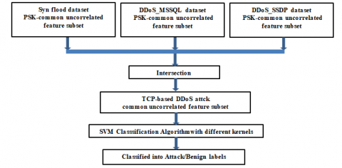 SVM classification gives better classification results with both PSK and TCP common feature subsets on TCP based DDoS attacks. An SVM classifier with ‘linear’ kernel produces the best accuracy, specificity and classification results consists of precision, recall, and F1-score on a Syn attack dataset with PSK common uncorrelated feature subset. An SVM classifier with both ‘linear’ and ‘poly’ kernels produce better accuracy, specificity and classification results consist of precision, recall, and F1-score on Syn attack data set with TCP based DDoS attacks common uncorrelated feature subset. An SVM classifier with ‘linear’ and ‘poly’ kernels give accuracy value 99.95% with both PSK and TCP-based DDoS attacks common uncorrelated feature subset. SVM classification algorithm with ‘rbf’ kernel produces better accuracy, specificity and classification results on MSSQL DDoS attack data set with both PSK and TCP-based DDoS attacks common uncorrelated feature subset. The SVM classification algorithm gives 99.52% accuracy with ‘rbf’ kernel on MSSQL dataset with PSK common uncorrelated feature subset. The SVM classification algorithm gives 99.54% accuracy with ‘rbf’ kernel with TCP-based DDoS attacks common uncorrelated feature subset on MSSQL DDoS attack data set. SVM with poly kernel produces better classification results on SSDP attack dataset with PSK common uncorrelation feature subset. SVM with ‘rbf’ produces better classification results on SSDP DDoS attack data set with a common uncorrelation feature subset of TCP-based DDoS attacks. The SVM classification algorithm gives 99.89% accuracy with ‘rbf’ kernel on SSDP DDoS attack data set with PSK common uncorrelated feature subset. The SVM classification algorithm gives 99.90% accuracy with ‘rbf’ kernel with TCP-based DDoS attacks common uncorrelated feature subset on SSDP dataset. SVM with ‘rbf’ kernel produce better classification results on a customized dataset with a common uncorrelation feature subset of TCP based DDoS attacks. The SVM classification algorithm gives 99.80% accuracy with ‘rbf’ kernel with PSK common feature subset on customized dataset. The SVM classification algorithm gives 99.23% accuracy with ‘rbf’ kernel with TCP-based DDoS attacks common uncorrelated feature subset on customized data set.