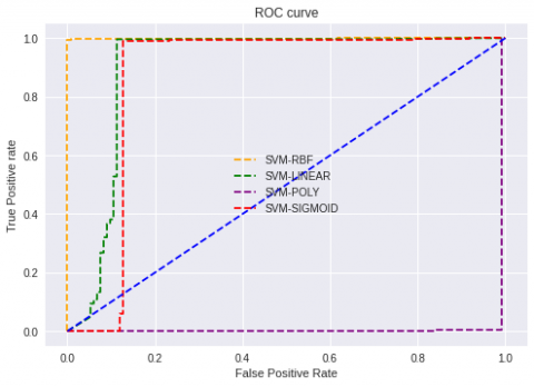 ROC-AUC scores of the SVM classifier with different SVM kernels on Syn attack data set with TCP common uncorrelated feature subset shows Table 18. An SVM classifier with ‘rbf’ kernel gives the best ROC-AUC scores on SYN, MSSQL, and SSDP TCP-based DDoS attack data sets, but it gives better ROC-AUC score value of customized data set with TCP common uncorrelated feature subset. While SVM classifier with ‘poly’ kernel gives the best ROC-AUC score on customized data set and better score on SSDP dataset, but it gives poor ROC-AUC score values on Syn and MSSQL attacks datasets. In terms ROC_AUC score, SVM with ‘sigmoid’ kernel gives better score on MSSQL attack data set, good score on customized data set and it gives poor values on Syn and MSSQL attack data sets. Conclusion of these results, SVM classifier with ‘rbf’ produces best ROC-AUC scores on TCP-based DDoS attacks data sets with TCP common uncorrelated feature subset. Figure 7 to Figure 10 shows ROC curves of the SVM classifier with different kernels on Syn flood, MSSQL, SSDP and customized datasets.