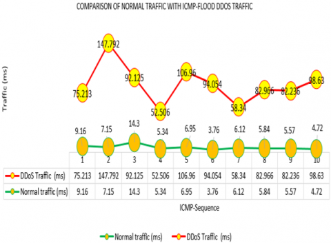 Figure 10 describes the comparison of regular traffic with the occurrence of ICMP-Flood DDoS. The figure shows the time required (ms) for each ICMP sequence when regular traffic is 3.76 ms, and the highest is 14.3 ms, while the lowest ICMP-Flood DDoS is 52.506 ms and the highest is 147, 792 ms. This shows an increase in traffic at the lowest point of 73% while at the highest end of 64%, which causes the server to experience down so that it cannot serve clients.