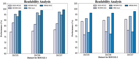 An association of the readability of the MRNN-MHS method and other existing methods is shown in Figure 9 and Table 5. The graphic establishes that the MRNN-Efficient MHS's Text Summarization technique has improved performance while maintaining readability. For example, the readability value for the MRNN-MHS model with the data set DUC05 on ROUGE-1 is 98.43%. In contrast, the readability values for the ESDS-MCSO, MCRMR-SSO, MCRMR-PSO, and MWi-Sum models are, respectively, 79.32%, 87.65%, 95.32%, and 93.21%.