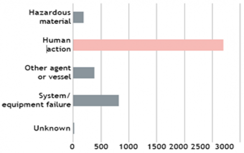 Figure 1 shows the category that represents a potential cause or factor contributing to maritime accidents. The figure is showing how many accidents fall into each category for each year from 2011 to 2018. By looking at the distribution it can be understood which factors contribute more or less to maritime accidents over the specified time period. Here, in Figure 1 human actions cause the highest leading to maritime accidents and followed by system/ equipment failure.