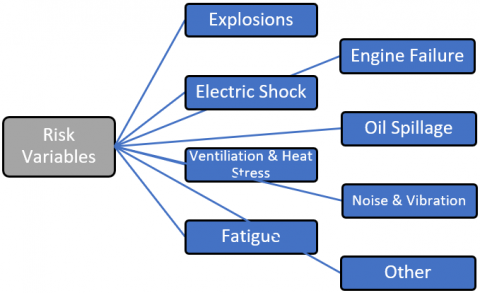 In the context of this study, a closer examination reveals the eight most crucial risk variables: explosions, engine failure, electric shock, oil spillage, ventilation and heat stress, noise and vibration, fatigue, and others per indicated in Figure 2. These variables stand at the forefront, demanding thorough scrutiny to comprehend their intricate interplay and implications [24].