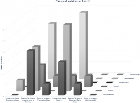 From Figure 5 struck by and caught in, out and between were found to be major causes of accidents at level 1. From Figure 6, adverse mental stress and total stress were the major causes of accidents at level 2. Like level 1, struck by and caught in, out and between were major causes of accidents at level 3 and 4 as shown in Figure 7 and Figure 8, respectively.
