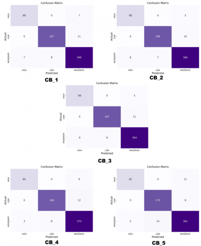 Figure 8 illustrates the performance of the five assembled models (CB_1 to CB_5) in the prediction of seismic vulnerability, categorized as High, Moderate, and Low. In the High class, models CB_2 and CB_3 exhibited the highest number of correct predictions, with 88 each, while CB_5 demonstrated the lowest performance, with 82 correct predictions. In the Moderate class, model CB_4 stands out with 370 correct predictions, followed by CB_1 and CB_2 with 366, CB_3 with 364, and CB_5 with 362. In the Low class, all models exhibited comparable performance, with CB_5 achieving the highest accuracy with 270 correct predictions. The results demonstrate a high level of accuracy for model CB_4 in the Moderate class and for CB_2 and CB_3 in the High class.