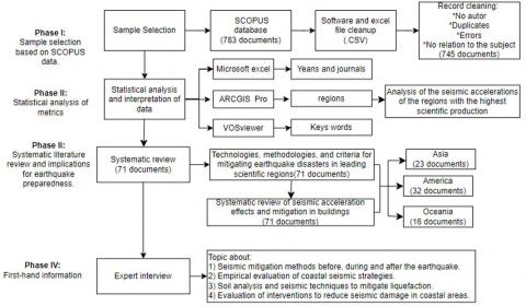 This research has focused on a secondary study using the VOSviewer tool to recognize seismic hazards in the Pacific Ring of Fire and evaluate research possibilities using metrics. The methodology of this study approaches in three phases: I) sample selection from SCOPUS data, II) statistical analysis of metrics about publications using VOSviewer software, and III) systematic literature review and implications for earthquake preparedness [21]. Figure 1 shows the methodological diagram applied in this study.