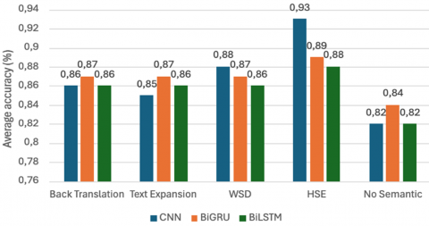 The HSE-CNN approach achieved the highest overall accuracy (93%), underscoring the contribution of semantic expansion in enhancing CNN performance. BiGRU and BiLSTM showed comparable results, with BiGRU initially outperforming CNN under non-semantic conditions. However, after semantic enrichment, BiGRU and BiLSTM reached accuracies of 89% and 88%, respectively.