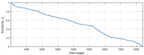 The detected anomaly d2(i) is assumed to be a failure in the reliability calculation. Failures will be counted cumulatively, D2(i). Reliability calculations are carried out based on Benard's approximation which is shown in Eq. (10) [14].