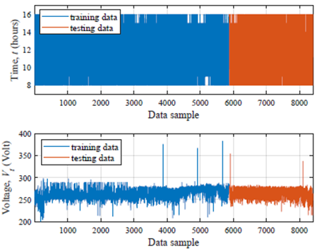 The results of the data division for training data and test data are shown in Figure 3 with a composition of 70:30. Figure 3 (a) is a graph of the training data and test data before the outliers and Figure 3 (b) is a graph of the training data and test data after the outliers. Outlier data is done to remove data that is outside the ideal data range. Data before the outlier range between 200.3 to 383 and after the outlier, data range between 223.6 to 298.2 with 51 data is removed. Outliers can have a significant influence on ANN modeling in real time monitoring. Figure 3 (a) shows that the voltage value fluctuates within the specified time range, with one instance where the value significantly spikes. Therefore, an outlier is performed for values that are outside the range so that Figure 3 (b) is obtained.
