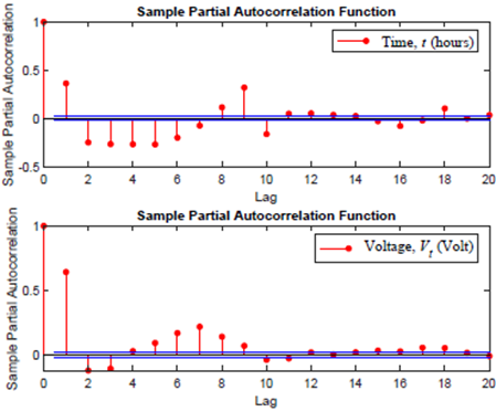 PACF is the correlation between x(i) and x(i-1) after removing any linear dependence or x(t) and x(t-h). This coefficient is denoted ϕhh with a different, h [13]. If x(t) is a normally distributed time series, then: