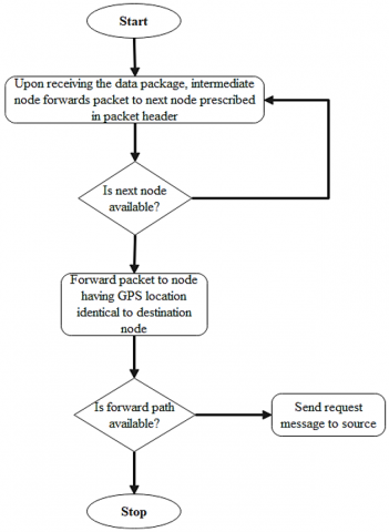 In location aware routing, position of other nodes can be acquired using GPS. It helps to improve the scalability of the network as stated in the study [26]. It consisted of route establishment and maintenance phase. It also explored maximum expectation within transmission range that used GPS position for LAR method. The study also proposed geographical landmark routing (GLR) to provide a solution to the triangular routing problem and the blind detouring problem according to the study [27].