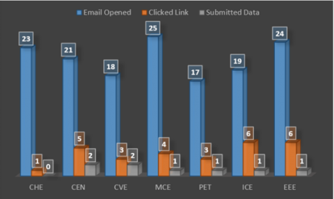 In Figure 3, the data illustrates the count of 500-level students enrolled in each engineering programmes which engaged with phishing emails. This engagement includes opening the email, clicking the embedded link, or submitting personal information. Additionally, the figure presents the total number of 500-level engineering students in each respective programme.