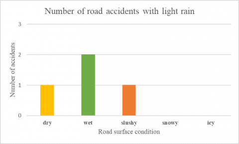 Figure 7 shows the number of accidents when there was light rain. As is shown, 2 accidents occurred when the road surface was wet, and 2 accidents happened in dry RSC and slushy RSC.