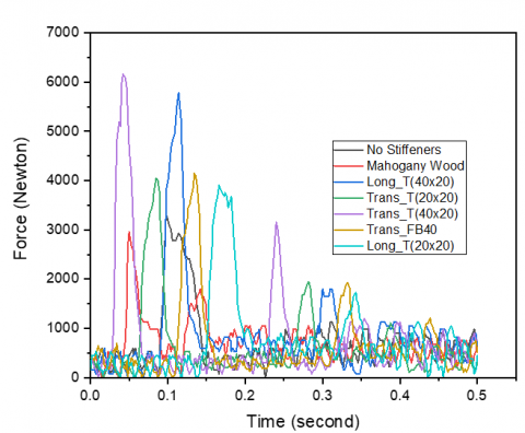 The comprehensive results of the drop test experiment, aimed at demonstrating the crashworthiness of wooden and alloy fishing boat materials both with and without side beam impact reinforcement, are depicted in Figure 16. The graph reveals that the larger the cross-sectional area of the stiffeners, the greater the reaction force of the ship's hull structure can withstand. A larger cross-sectional area results in a larger cross-sectional modulus and a more significant moment of inertia of the stiffener. The cross-sectional area of the stiffeners increases, and the ship's hull structure can withstand greater forces. This relationship is attributed to the larger cross-sectional modulus and increased moment of inertia of the stiffener [57, 58]. The order of magnitude of Force for stiffener ID is as follows: Trans_T(40×20), Long_T(20×20), Trans_T(20×20), Trans_FB40, Long_T(20×20), Long_FB40, Alloy without stiffeners (existing), and Mahogany wood 40 mm. The maximum Force is illustrated in Figure 16 and Table 4. This study provides valuable insights into the structural integrity of fishing boats under various conditions.