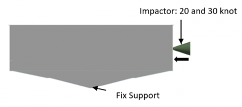 In this modelling, the impactor has a speed of 20 knots and 30 knots with an interval of 0.005 seconds. Its shape is a cone with a ball-shaped tip. The meshing size in the crash box is set with an average skewness value of 5.91×10-2 [39]. The mesh quality is checked using the aspect ratio and Jacobian criteria [41, 42]. The simulation results are analyzed in terms of stress, strain, deformation, and energy absorption.