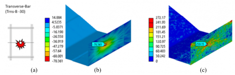 Figure 12. Trns-T-30 stiffener ID: (a) Crash area, (b) deformation in mm, (c) stress in Mpa