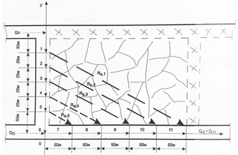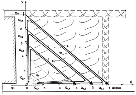 The formation and diffusion processes of the gas-air mixture in the mined-out areas remain poorly understood during the ventilation of working sections using a direct-flow ventilation system with refreshed exhaust airflow. Previous studies [6-10] and the obtained patterns of air leakage through the mined-out space assume a constant value of its specific aerodynamic resistance. At the same time, according to other studies [17, 18], the specific aerodynamic resistance changes as the distance from the longwall face increases, which complicates the task of determining the filtration velocity and flow direction in the collapsed space.