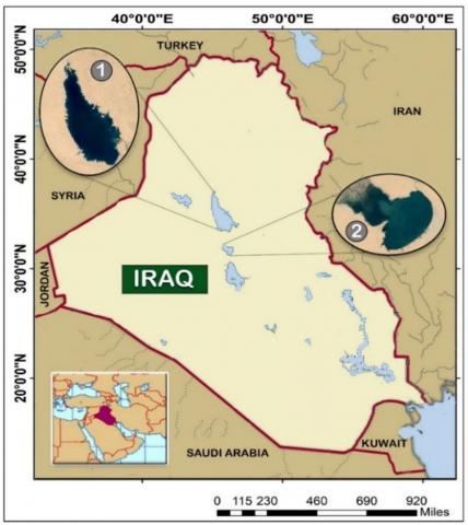 Figure 1. The lakes distribution: (1) Tharthar, and (2) Habbaniyah
