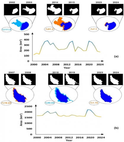 Spatial and temporal transformations in the study area from 2000 to 2024 were analyzed by processing 48 high-quality Landsat images using the USGS Global Visualization. These images are accessible via the Landsat look platform (https://landsatlook.usgs.gov/explore) and are suitable for assessing lake surface areas and geospatial mapping.