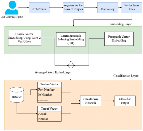 Since the problem of intrusion detection is a classification problem with the packet, including the textual form of traffic data, the usage of embedding models in the IDS can be beneficial not only for the improvement of detection accuracy but also for reducing the associated cost and response time. A similar concept of ours is proposed in the study [15] called Deep Packet, which uses raw traffic packet data as input and solves the problems of traffic type identification and application identification. In a deep packet, the entire packet is fed into the DL model for the auto-selection of features; this method is not ideal for the complicated multiple-channel input types.