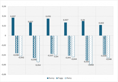 So basically, foggy and rainy weather indeed can lead to a higher risk of accident [48]. However, these situations encourage the drivers to reduce the speed [26, 27, 30] to meet the psychological needs, improve driver reaction abilities, and compensate for the negative impact of bad weather on the driving task. The change in behavior, namely reducing vehicle speed, indicates that drivers tend to be more careful, concentrated, and alert [24].