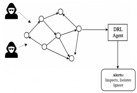 Accordingly, this non-threatened environment will be at the mercy of stochastic and unpredictable attempts to gain access and compromise the overall reliability of the network. These include malicious packet injections, DoS attempts, or routing failures, and all could be directed towards either specific or arbitrary nodes. Attack surfaces will be treated as external entities that are attempting to compromise the reliability and security of the network. An attack that involves a targeted malicious node can leave itself open to packet injections, hijacked routes, or deterioration of energy usage, before critical quality-of-service and network lifetimes are affected. Therefore, a centralized DRL agent is to be a part of the overall architecture.