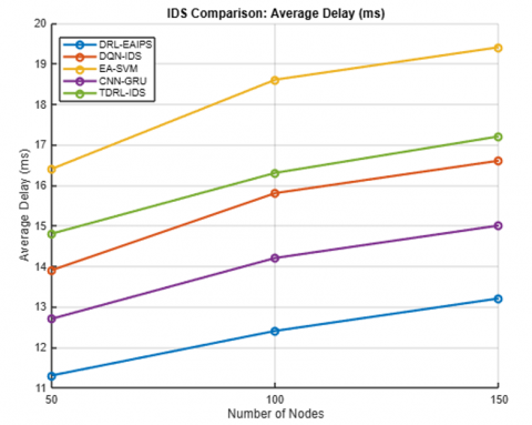 Table 3 shows that the deployment of 100 nodes for DRL-EAIPS exhibited superior performance. DRL-EAIPS reached the best accuracy rate at 96.87%, the lowest FPR at 2.91% and energy consumption per node of 0.143 J, leading to a prolonged network lifetime of 4321 rounds. The average delay was reduced to 12.4 ms, and the transmission costs were low as a result of the DRL agent's energy-aware conditions to either inspect or ignore packets based on its RL experience. Other models, such as CNN-GRU Hybrid IDS, could not achieve DRL-EAIPS's accuracy of 94.23% or delay of 14.2 ms, but they consumed more energy of 0.178 J, thereby impacting lifetime compared to DRL-EAIPS. Even though DQN-Based IDS was adaptable, it did not include any energy-constrained aspects in its reward model, so it suffered with respect to energy and lifetime performance. These results demonstrate that inclusion of both energy and anomaly context when applying RL leads to balanced and ecologically valid intrusion prevention behavior.