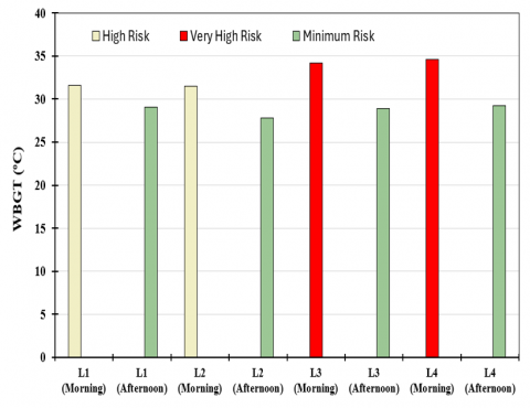 In this study, WBGT values of up to 34.6℃ were recorded during the morning shift, exceeding the 29.76℃ reported at an oil terminal in Iran [52]. The difference observed between the two studies could be attributed to environmental factors, underscoring the need for thermal assessments tailored to specific regions and times of day [53]. These temperatures impact occupational health, necessitating measures such as breaks, hydration, and the proper use of protective equipment to mitigate risks in this vulnerable sector [54]. Additionally, heat stress poses a significant risk, particularly near heat tolerance limits [55].