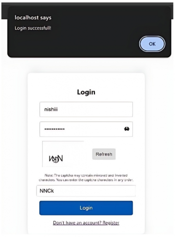 This process ensures that all necessary user details are collected and verified before account creation. The Login Page Module is responsible for presenting the login interface to the user. It displays the login page with input fields where users can enter their username or email and password. To enhance user experience and security, this module includes a feature that allows users to toggle the visibility of their password. By clicking on an eye icon, users can choose to either reveal or conceal their password as they type, reducing the likelihood of input errors. The Captcha Module is integrated to add an extra layer of security to the login and registration processes. It generates a unique CAPTCHA image each time the page is loaded, incorporating mirror alphabets and motion effects to make it challenging for automated scripts to decipher. This module also provides a refresh option, allowing users to generate a new CAPTCHA image if the current one is difficult to read.